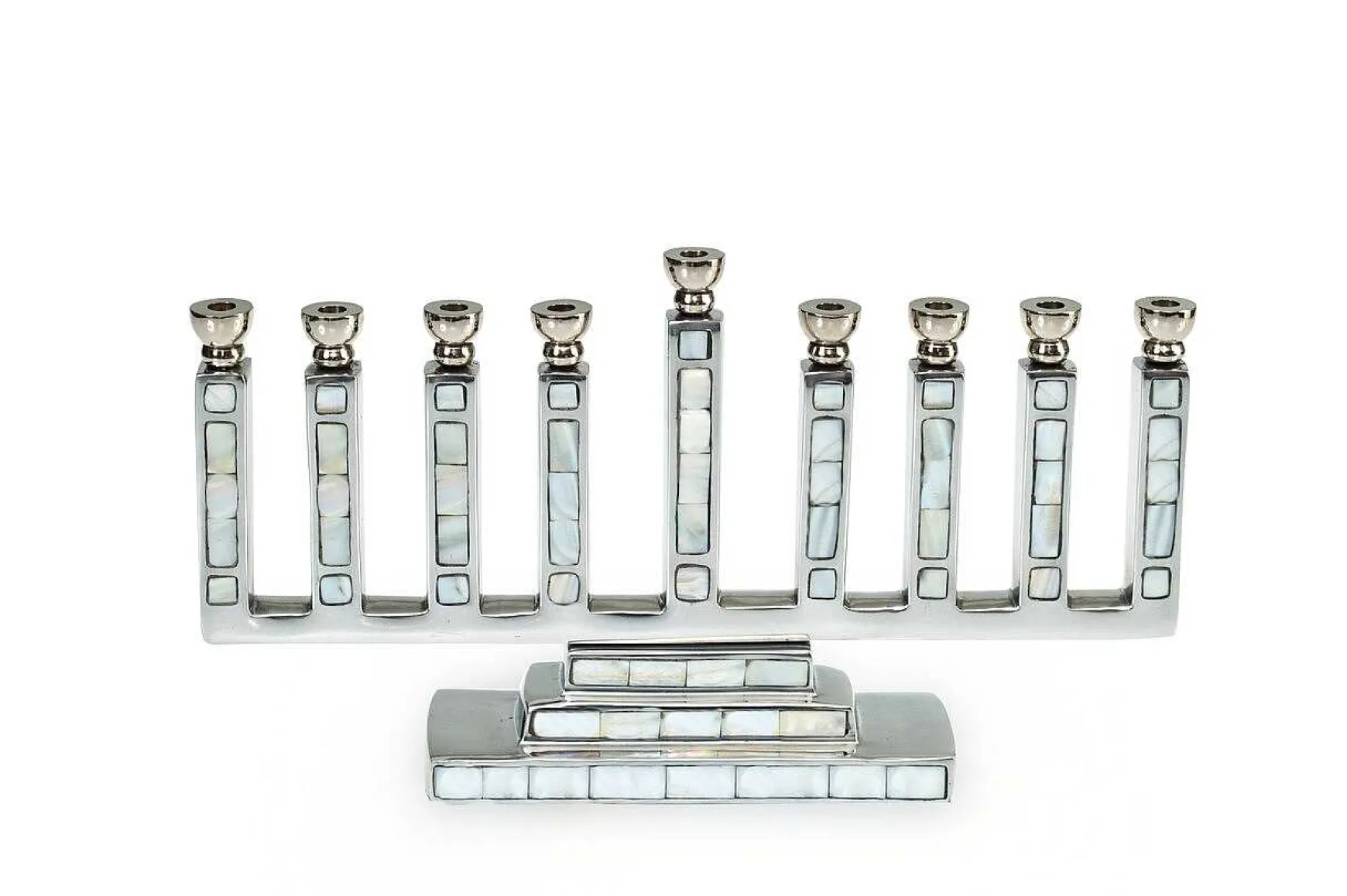 Classically Modern Styling Of The Classic Menorah Is Seeped In Tradition. This Stunning Iconic Piece Will Have Your Guests Celebrating The Occasion With Pure Joy. With Hand Cut And Hand Polished Mother Of Pearl Mosaic, This Piece Is Truly Meant To Be Heirloom Quality That Will Surely Be Passed Down Generation To Generation.