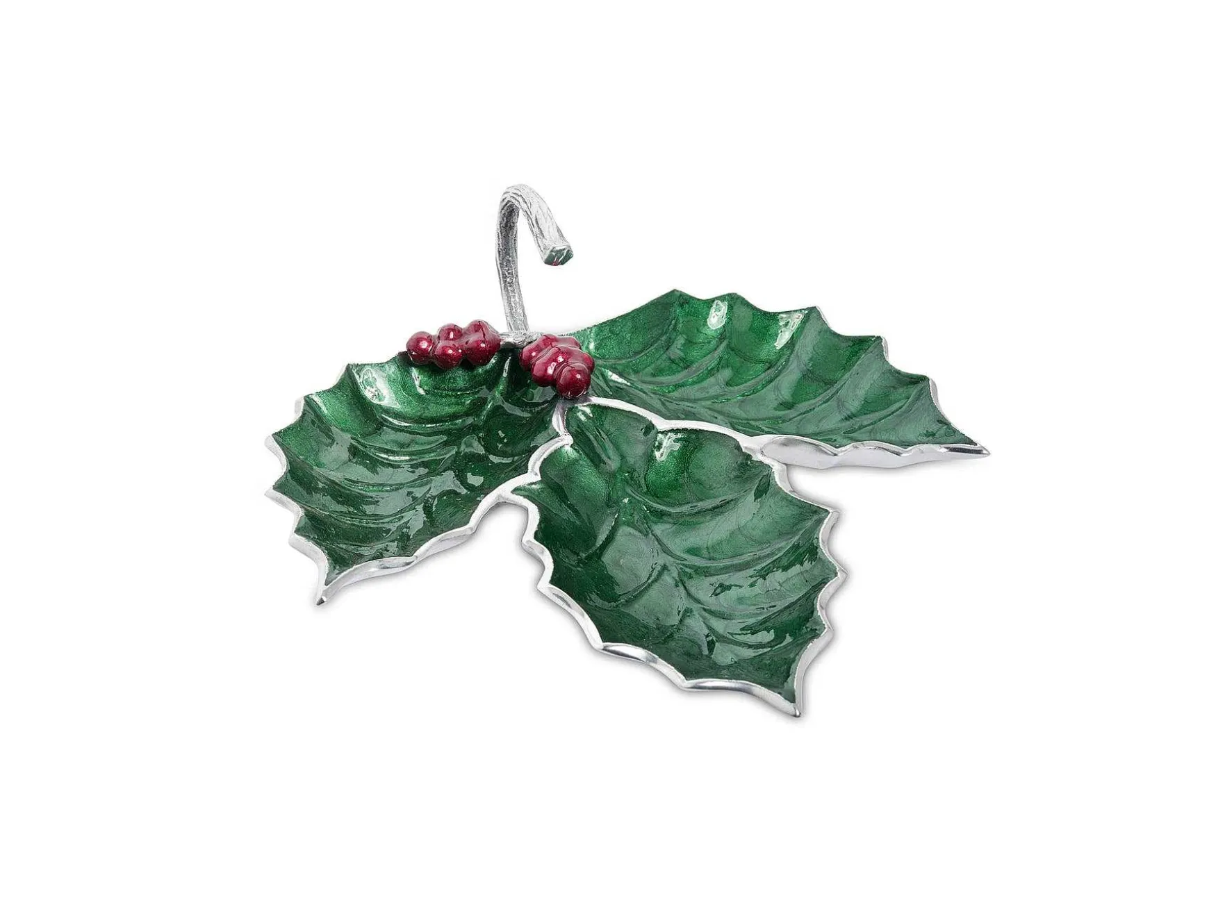 Stand Out This Holiday Season With The Holly Sprig 13″ 3-Part Server. From The Luxurious Richness Of The Crushed Mother Of Pearl Infused Enamel To The Signature Thumbprint Swirl, Each Piece Is Truly One-Of-A-Kind And Will Surely Become A Family Heirloom. This Delightful Serving Piece Is Ideal For Dips, Sauces And Condiments. Add A Holly Sprig Spreader And You Have The Perfect Attention To Holiday Detail. Mix And Match This Piece With Other Stunning Items From The Holiday Collection Or The Florentine Collection, And Create A Memorable Tablescape That Will Be Seeped In Tradition. The Holiday Collection Is Food Safe And Can Go Into The Freezer And The Oven Up To 250 Degrees.