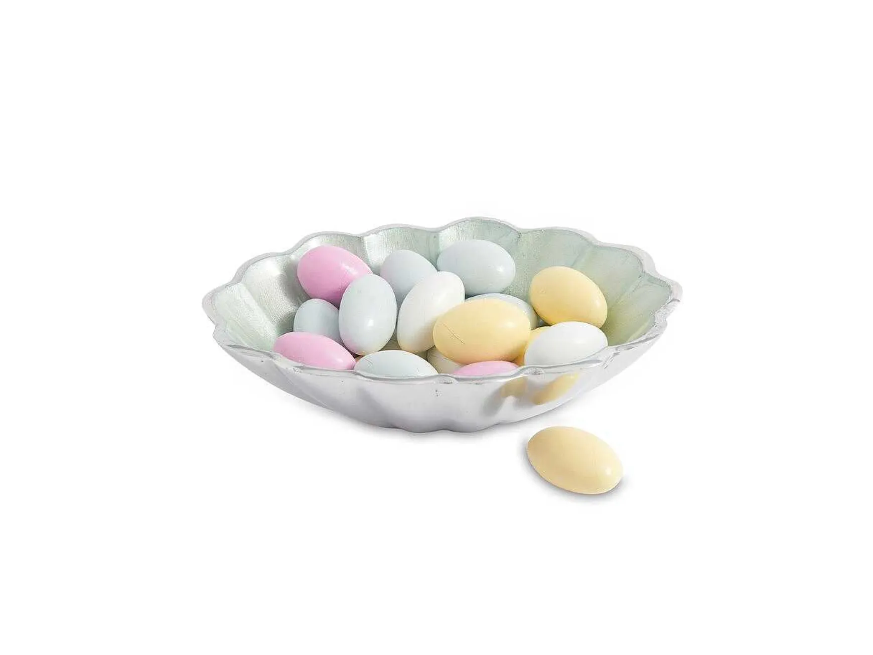 The Darling Scalloped Petal Edge Of The Peony 5″ Oval Bowl Is Reminiscent Of The Layered Petals Of The Peony Flower. The Luxurious Color Palettes Embodied In The Crushed Mother Of Pearl Infused Enamel With The Signature Thumbprint Swirl, Adds Luster To Every Table. Perfect For Nuts, Sweet Little Treats And Even Your Favorite Jewelry On Your Nightstand! Pair This Bowl With The Peony 14″ Or 6″ Rectangular Tray Or With The Peony 6″ Petite Plates For The Perfect Coupling. This Updated Traditional Bowl Is Also The Ideal Compliment To The Classic And By The Sea Collection. Collect All Three Sizes And Nest Them For Easy Access, Easy Storage And To See The True Petals Of The Luscious Peony Flower. The Peony Collection Is Made Of Sand-Cast Aluminum, Is Food Safe And Can Go Into The Freezer And The Oven Up To 250 Degrees.