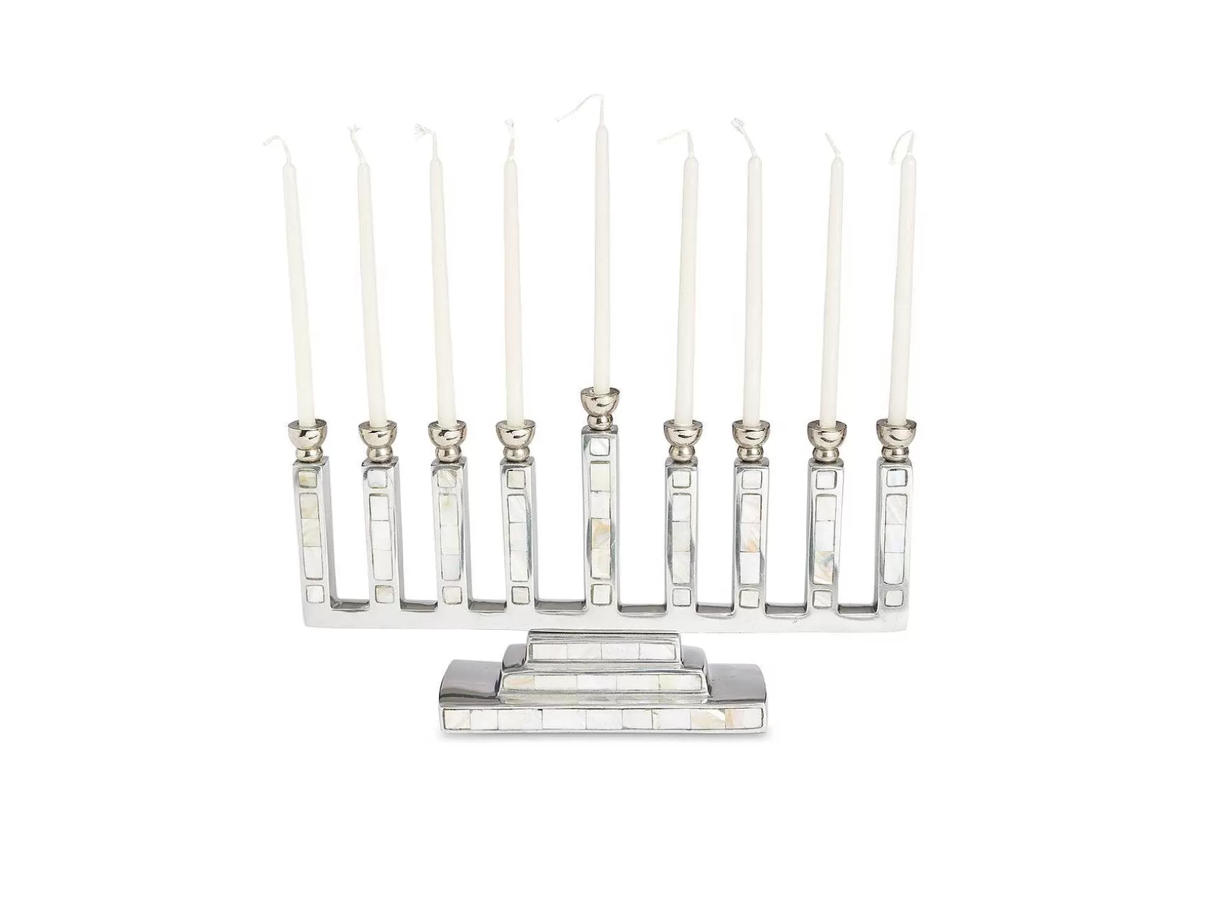 Classically Modern Styling Of The Classic Menorah Is Seeped In Tradition. This Stunning Iconic Piece Will Have Your Guests Celebrating The Occasion With Pure Joy. With Hand Cut And Hand Polished Mother Of Pearl Mosaic, This Piece Is Truly Meant To Be Heirloom Quality That Will Surely Be Passed Down Generation To Generation.
