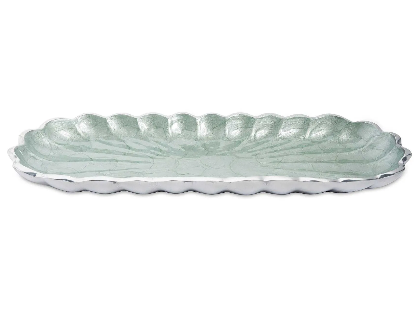 The Darling Scalloped Petal Edge Of The Peony 14″ Rectangular Tray Is Reminiscent Of The Layered Petals Of The Peony Flower. The Luxurious Color Palettes Embodied In The Crushed Mother Of Pearl Infused Enamel With The Signature Thumbprint Swirl, Adds Luster To Every Table. Perfect For Crackers, Cheese Or Vibrant Fresh Fruit, Or Partner This Tray With The Peony 4″ Or 6″ Petite Bowl For The Perfect Pairing Of French Bread And Your Favorite Dip. This Updated Traditional Tray Is Also The Ideal Compliment To The Classic And By The Sea Collection. Collect All Three Sizes And Nest Them For Easy Access, Easy Storage And To See The True Petals Of The Luscious Peony Flower. The Peony Collection Is Made Of Sand-Cast Aluminum, Is Food Safe And Can Go Into The Freezer And The Oven Up To 250 Degrees.